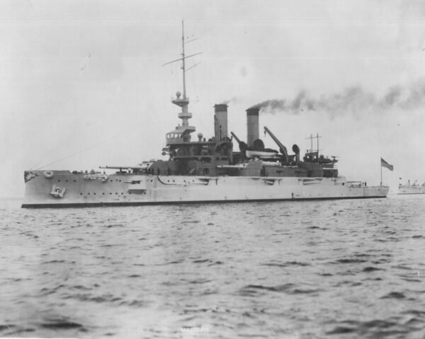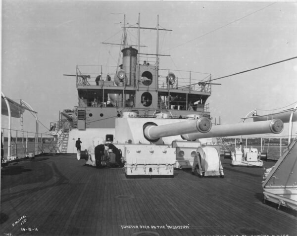 Mississippi Class Battleship: Displacement 13,000 Tons, Dimensions, 382’4″ x 77′ x 27′ (Max)Armament 4 x 12″/45 8 x 8″/45, 8 x 7″/45 12 x 3″/50, 2 21″ tt. Armor, 9″ Belt, 12″ Turrets, 3″ Decks, 9″ Conning Tower. Machinery, 10,000 HP; 2 vertical, triple expansion engines, 2 screws. Speed, 17 Knots, Crew 744.
